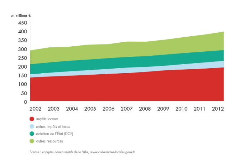 Les recettes de fonctionnement se situent, comme les dépenses, à un niveau par habitant supérieur à celui des autres communes de plus de 100 000 habitants (1 625 € contre 1 419 €). Elles ont augmenté à un rythme rapide (+37 % depuis 2002 et +17 % depuis 2008), nettement supérieur à celui de l’inflation (respectivement +19 % depuis 2002 et +5,8 % depuis 2008).