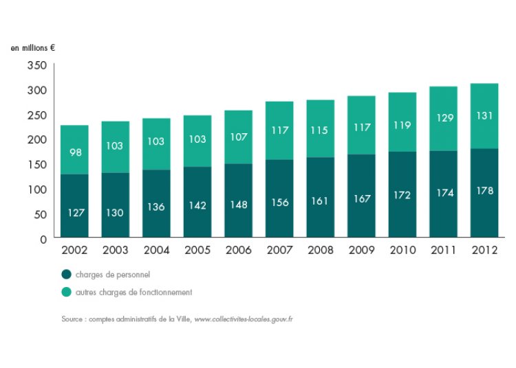 Les charges de fonctionnement s’élèvent en 2012 à 309 M€, soit 1 325 € par habitant, ce qui est légèrement supérieur à la moyenne constatée pour les communes de plus de 100 000 habitants appartenant à un groupement fiscalisé (1 296 € par habitant).