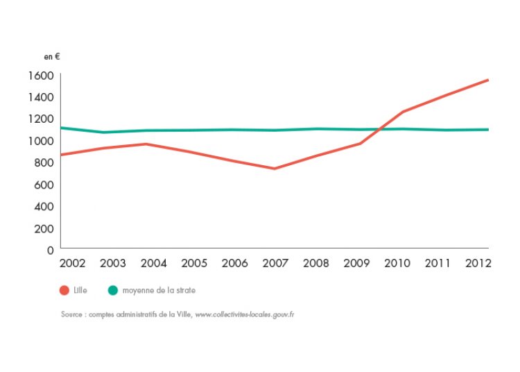 Jusqu’en 2009, la dette par habitant de la ville de Lille était inférieure à celle de la moyenne des autres communes de la strate (communes de plus de 100 000 habitants appartenant à un groupement fiscalisé). Ramenée à la population, la dette de la ville de Lille atteint 1 539 € en 2012, soit 42 % de plus que la moyenne de la strate.