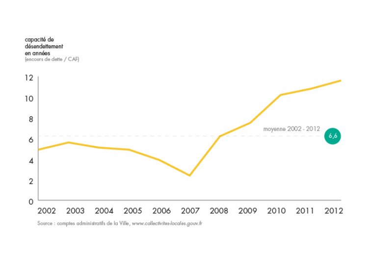 La capacité de désendettement de la ville de Lille s’est détériorée sur la dernière mandature, passant de 6,2 années en 2008 à 11,6 années en 2012, soit un niveau élevé. Ainsi, il faudrait près de 12 années à la ville de Lille pour rembourser sa dette accumulée au 31 décembre 2012 si elle y consacrait la totalité de sa capacité d’autofinancement (CAF). En 2007, seuls 2,4 années étaient nécessaires pour résorber la dette grâce à l’autofinancement de la ville.