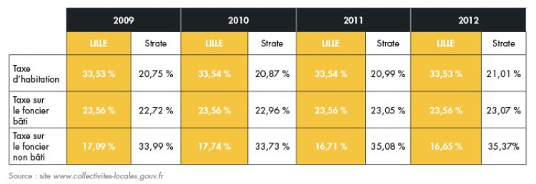 Pour la commune, les recettes de fiscalité directe (TH, TFB, TFNB) ont augmenté de 11 % entre 2008 et 2012, soit une hausse de 13 M€. La taxe sur le foncier non-bâti a connu la plus forte progression (+86 %), même si son produit reste très inférieur à celui des deux autres taxes (327 000 € en 2012). La taxe d’habitation est la première ressource fiscale de la commune (70 M€ en 2012), et son taux est particulièrement élevé (33,55 %), même s’il est légèrement inférieur au taux en vigueur en 2007 (33,97 %). Le taux de la taxe d’habitation à Lille est nettement supérieur au taux moyen de la strate.