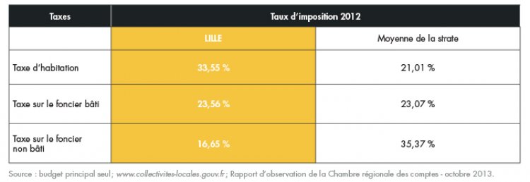 La fiscalité de la ville de Lille repose principalement sur trois impôts locaux : la taxe d’habitation, la taxe sur le foncier bâti et la taxe sur le foncier non bâti. Le produit total de ces trois impositions est de 128 M€ en 2012.