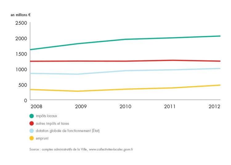 La relative stabilité en tendance des recettes réelles de la ville (6,6 Mds€ en 2008, 7 Mds€ de 2009 à 2011 et 6,6 Mds€ en 2012) recouvre deux évolutions en sens inverse : une baisse de certaines recettes conjoncturelles[3], qui est compensée par une hausse de la fiscalité locale (dont la part dans les recettes passe de 37 à 46 % entre 2008 et 2012) ainsi que de l’emprunt.