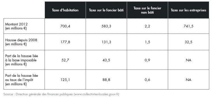 L’ensemble des ressources fiscales a augmenté de 24 % entre 2008 et 2012, passant de 2,5 Mds€ à 3,1 Mds€. Le montant des taxes diverses est lui passé de 0,9 Md€ en 2008 à 1 Md€ en 2012. Le produit des impôts locaux a fortement augmenté (+27 %), passant de 1,6 Md€ en 2008 à 2,1 Mds€ en 2012.
